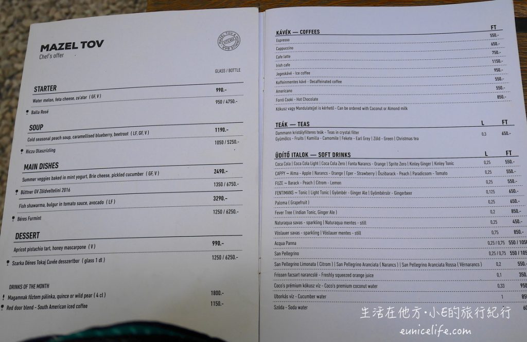 【匈牙利】🇭🇺❮布達佩斯❯透天採光森林庭園式地中海素食料理餐廳「Budapest, Mazel Tov」☕️悠閒享受的下午咖啡時光☀️ Eunice 7 年前 translate 地中海料理餐廳「Budapest, Mazel Tov」真的是一家環境很有特色的餐廳,一走進來好像來參加友人的花園庭院婚禮,微亮的燈飾掛在中庭、一旁的綠樹垂下、人們坐在庭中享受美食與下午時光,這種氣氛讓人感覺到希臘式的午後時光。 這在布達佩斯「歌劇院站」附近的好處就是附近的餐廳、酒吧真的很多,而且每一家都很有特色。這個下午想來趕稿,所以就跟著朋友來坐坐這家美美的地中海餐廳,點一杯咖啡、一個點心,開啟悠閒的下午時光。 ▲Mazel Tov餐廳戶外的街景,一開始蠻難找的,一進去別有洞天。(攝影/小E) ▲工業風的綠蔭庭園,真的很像花園派對的場合。(攝影/小E) ▲下午的時候人不多,我們就坐在角落。(攝影/小E) ▲這邊的服務生制服也很可愛,男生要穿短褲配上藍襯衫,態度蠻親切的。(攝影/小E) ▲這是點的是「堅果無花果塔」+「熱拿鐵」,我在布達佩斯喝到的拿鐵都很好喝,很適合半糖的甜度,搭著甜點吃超幸福。(攝影/小E) ▲堅果塔的乳酪醬,香甜,是提拉米蘇的基底之一。(攝影/小E) ▲餐廳菜單。(攝影/小E) ▲整整坐滿一個下午,趕完稿了~推薦大家來體驗一下這個庭院放鬆的氛圍,覺得晚上在這裡來杯啤酒也很適合!(攝影/小E) 這次主要是來這邊喝下午茶,其實沒有嘗到他的特色料理,我的旅伴點了一份以色列菜,好像是膺嘴豆泥之類的主食,我們兩個都不合口味(可能是不習慣這個豆子的味道)。對於地中海素食有興趣的朋友們可以來試試看! 布達佩斯 帥哥早午餐 STIKA 布達佩斯 世界上最美的麥當勞 熱門文章與頁面︰【德國】❮DM購物必買❯🇩🇪Bad Heilbrunner 天然感冒茶、花草茶系列中文翻譯包 超健康又便宜的好禮物+退稅教學【德國】🇩🇪❮DM購物必買❯我的德國藥妝店購物推薦清單與退稅教學👜面膜、花草茶、護髮油、月亮杯【越南】🇻🇳我從越南帶回來的3個伴手禮/禮物🎁開箱文:咖啡☕️、河粉🍜、綠豆糕🍴【捷克】🇨🇿❮布拉格❯歐洲必買天然有機的香芬保養品「菠丹妮Botanicus」💐我的購買伴手禮清單介紹🧝🏻♀️滿2000克朗的機場退稅教學【義大利】🇮🇹 ❮米蘭❯ 藥妝、點心伴手禮必買購物清單 個人推薦 🎁 德國dm藥妝店、有機花草茶、洗髮乳、illy咖啡、Loacker威化餅
